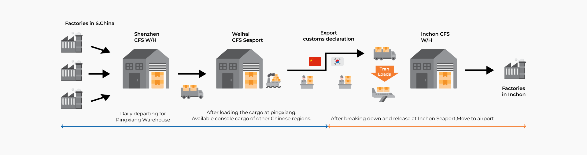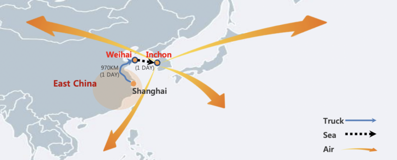 | Location | Booking | Shanghai CFS CLS | Shanghai CFS Departure | Weihai CFS Arrival | ETD Weihai | ETA Inchon Airport | Frequency | Lead Time |