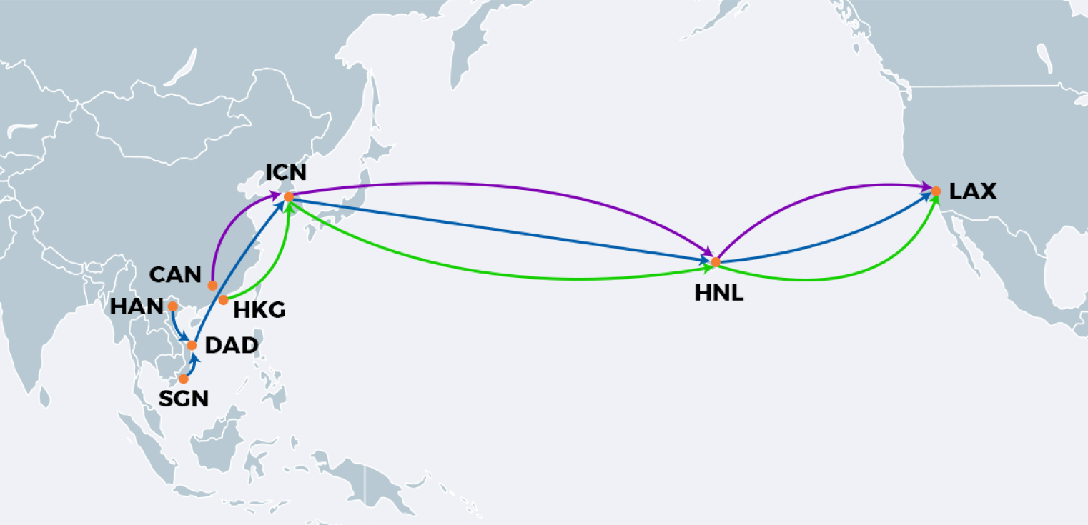 Vietnam : DAD (Danang) → ICN (Inchon) → HNL (Honolulu) → LAX (LA)